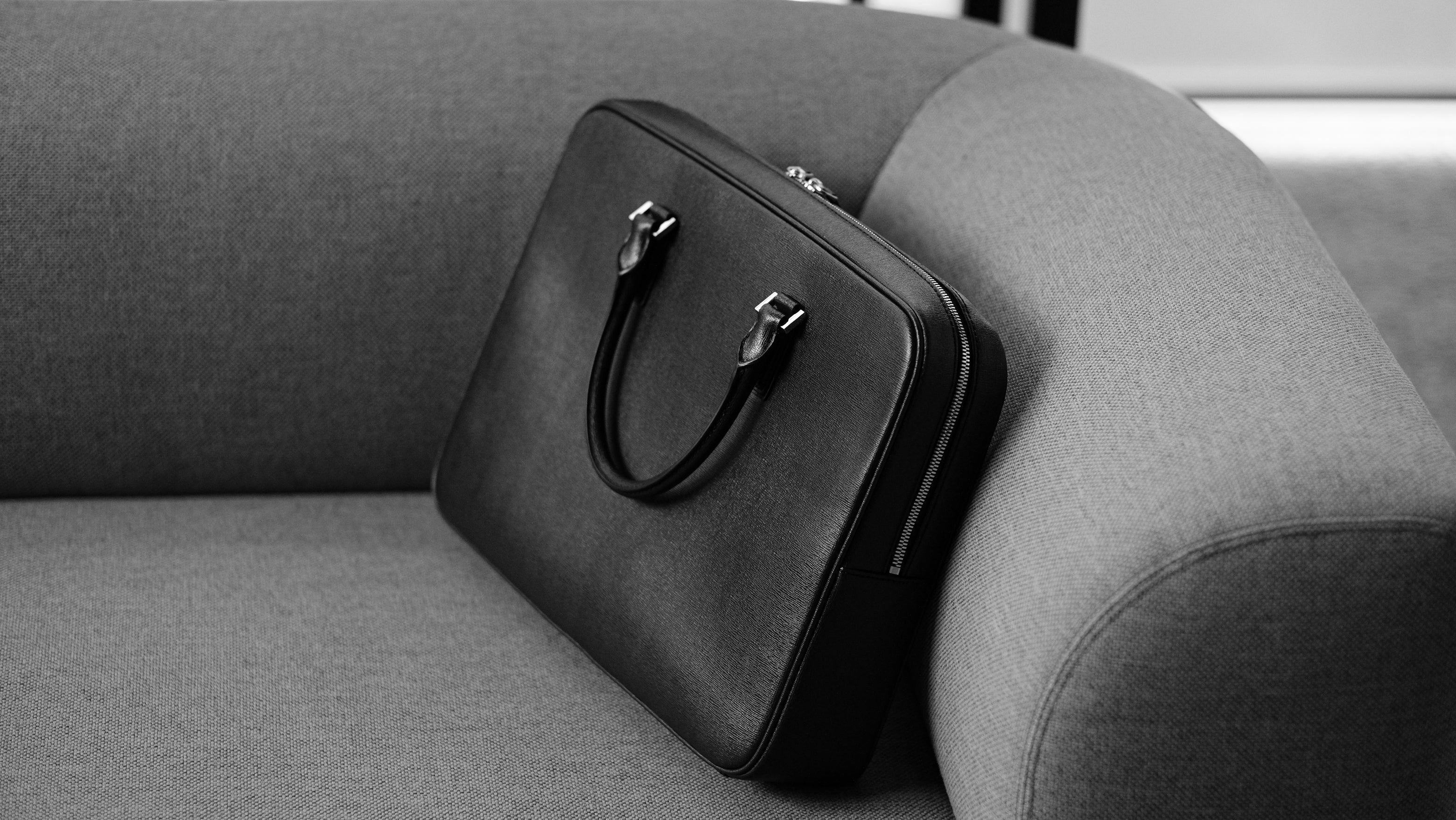 軽量で耐久性の高いブリーフケース。使用しているイタリアンサフィアーノレザーは、細かい独特な筋模様の型押し加工を施した牛革で、傷や汚れがつきにくく、丈夫な素材です。上品な艶がラグジュアリーを感じさせ、ワンランク上の装いに。