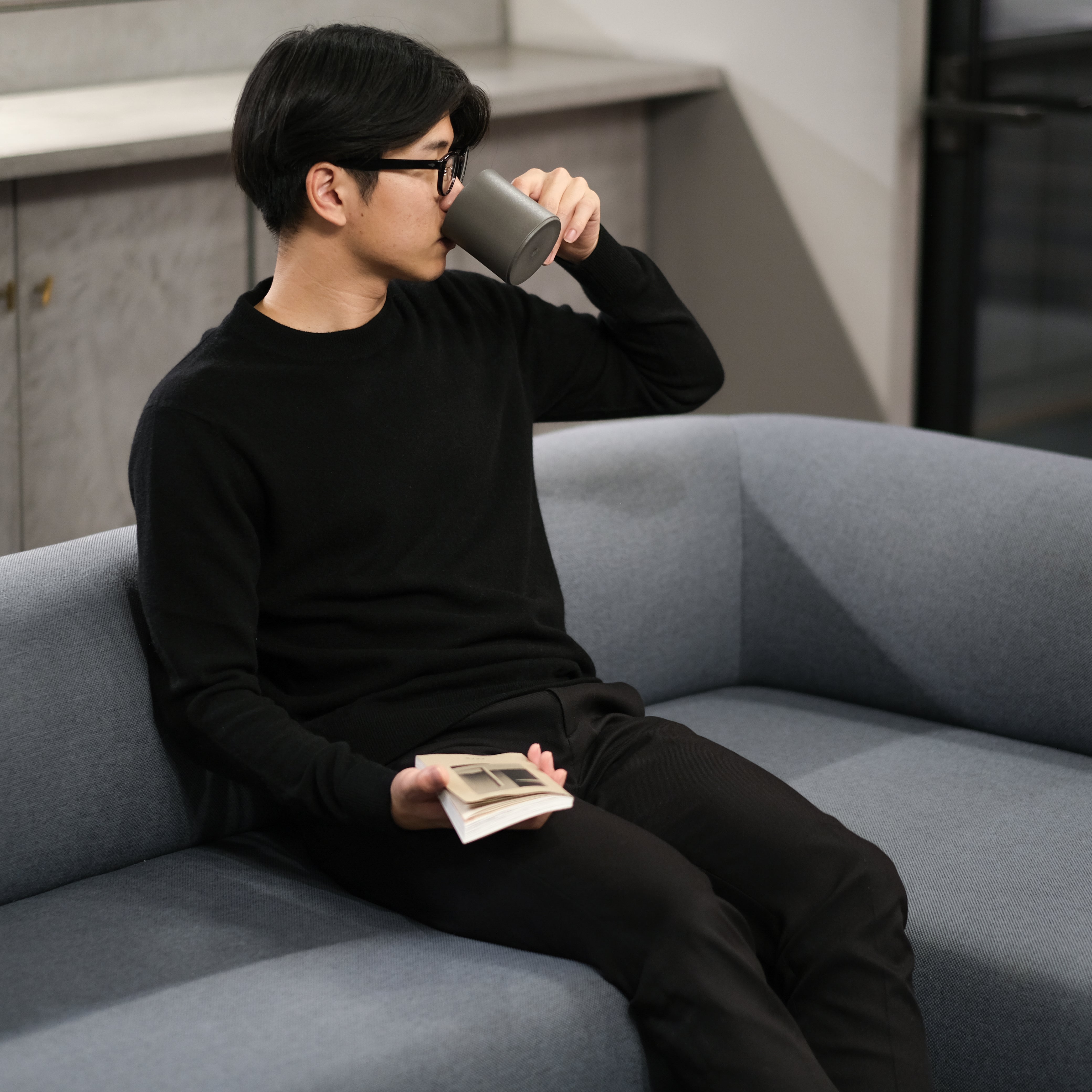 シンプル、かつ大胆に使用したカシミヤマフラーはつけるたび虜になります。